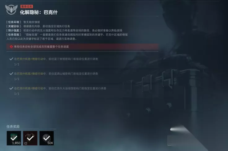 接下来便是化解隐秘巴克什,这个狗牌任务也算是改简单了,我们需要调查三个密码门,因为这次三个密码门的位置都在比较安全的区域。所以我们是可以一口气直接做完。