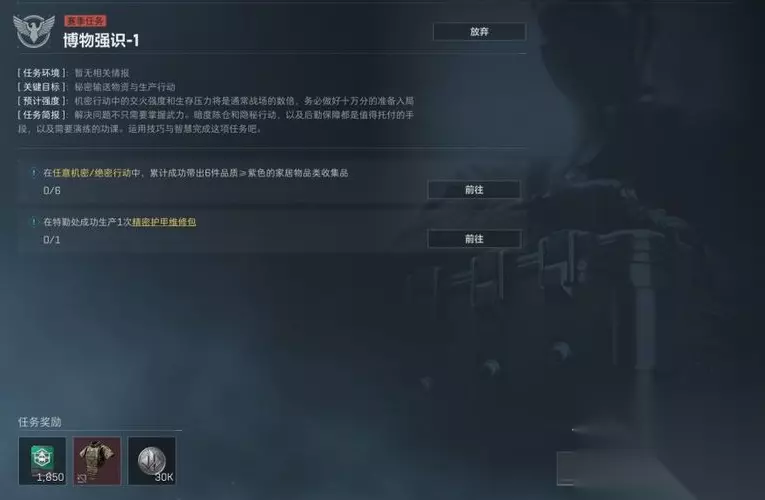 首先第一个狗牌任务改动是博物强识1,这个任务变动为在任意的机密行动或者是绝密行动中需要累计成功带出6件品质大于紫色的家居物品收集品,这个任务比较看玩家的人品,但总体难度并不算很高,另一个是需要生产精密护甲维修包,这个玩家们可以在任务之前提前准备好材料,然后直接搓出5级甲修。