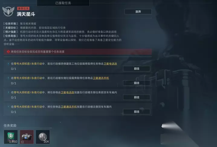 第三个改动的任务是满天星斗,这个任务简单来说反而改简单了。玩家们只需要进入行政楼周边去拿东西,然后拿完东西放东西,这个做起来也很快,需要注意的就是玩家们要进行避战。