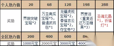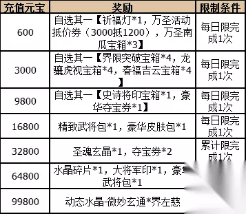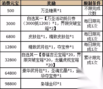商城上架 活动时间:2021-10-29 10:00:00~2021-11-04 23:59:59 界限突破礼包 售价:500元宝(界限突破折扣礼包:100通用元宝,每日限购1个,不可赠送,不可使用抵价券) 礼包内容:购买后可以获得手气卡*1,并赠送界限突破宝箱*1;打开宝箱可以获得界贾诩,界姜维,界祝融,界孙权,界袁绍,界刘禅,界孙策,界夏侯渊,界卧龙诸葛亮,界庞统,界魏延,界小乔,界孙坚,界庞德,界太史慈,界董卓,界邓艾,励战年兽*界刘备,励战年兽*界曹操,励战年兽*界张角,励战年兽*界孙权,傲视江东*界孙坚,誓不成佛*界孙策,花纤涟漪*界小乔,金秋霁月*界小乔,讨伐奸佞*界袁绍,圣魂玄晶,水晶碎片,大将军印,史诗将印宝箱等丰富道具其中之一(部分道具重复返还万圣糖果) 龙骧虎视礼包 售价:500元宝(龙骧虎视折扣礼包:100通用元宝,每日限购2个,不可赠送,不可使用抵价券) 礼包内容:购买后可得手气卡*1,并赠送龙骧虎视宝箱;打开宝箱可以得到张绣,卢植,龙骧虎视*张绣,张绣,卢植各等级皮肤,枭雄金印,圣魂玄晶,水晶碎片,豪华夺宝券,豪华皮肤包等丰富道具其中之一(部分道具重复返还万圣糖果/夺宝重置券) 春福吉云礼包 售价:500元宝(春福吉云折扣礼包:100通用元宝,每日限购2个,不可赠送,不可使用抵价券) 礼包内容:打开宝箱可以得到界赵云,马云騄,春福吉云*马云騄,春福吉云*界赵云,马云騄,界赵云,各等级皮肤,圣魂玄晶,水晶碎片,豪华夺宝券,豪华皮肤包等丰富道具其中之一(部分道具重复返还万圣糖果/夺宝重置券) 万圣南瓜礼包 售价:300元宝 礼包内容:购买后可获得手气卡*1,并赠送万圣南瓜宝箱*1;打开宝箱可以得到三国秀部件万圣貂蝉,吸血鬼魏延,南瓜灯,鬼宅围栏;南瓜洛神,恶魔的连营,万圣蛛网;南瓜边框,万圣南瓜,三国秀套装提瓜散糖部件,三国秀套装甜糖灵动部件,圣魂玄晶,水晶碎片,豪华夺宝券,豪华皮肤包等丰富道具其中之一(部分道具重复返还万圣糖果/夺宝重置券) 万圣狂欢纪念礼包 售价:3000通用元宝(累计限购1个,不可赠送,不可使用抵价券) 礼包内容:购买后可以获得绑定元宝*3000,万圣活动抵价券(满3000抵1000)*1,购买后可以获得龙骧虎视宝箱*2,春福吉云宝箱*2,界限突破宝箱*2,并赠送万圣纪念卡*1;拥有万圣纪念卡可于活动当日(连续七天)开始每日于-万圣点灯-自选其一【龙骧虎视宝箱*2,春福吉云宝箱*2,界限突破宝箱*2】,活动最后1日入手此卡也可领取7份礼品 微妙玄通礼包 售价:20000元宝(累计限购1次,不可赠送,不可使用抵价券) 礼包内容:购买后可以获得微妙玄通*界左慈 盲盒碎片礼包 售价:500元宝 礼包内容:购买后可以得到盲盒碎片*5 双11钜惠卡 活动时间:2021-11-01 00:00:00~2021-11-04 23:59:59 售价:4000通用元宝(每日限购1次,不可赠送,不可使用抵价券) 礼包内容:购买后可以得到11钜惠卡*1 双11预售周卡 活动时间:2021-10-29 10:00:00~2021-11-04 23:59:59 售价:8888通用元宝(累计限购1次,不可赠送,不可使用抵价券) 礼包内容:购买可得绑定元宝*3000,11钜惠卡,11钜惠礼包抵价券(3000抵用1200)*1,并赠送11预售卡*1,拥有11预售卡可每日领取绑定元宝*200,夺宝碎片*1(共计7次),活动最后1日入手11预售卡也仍可领取7份奖励 备注:11钜惠礼包抵价券有效期为14天,最终过期时间为2021-11-11 23:59:59 备注:11钜惠卡为时限道具,最终过期时间为2021-11-11 23:59:59 充值返利 活动时间:2021-10-29 00:00:00~2021-11-04 23:59:59 备注:充值活动仅支持游戏内部充值,以实际支付金额为准