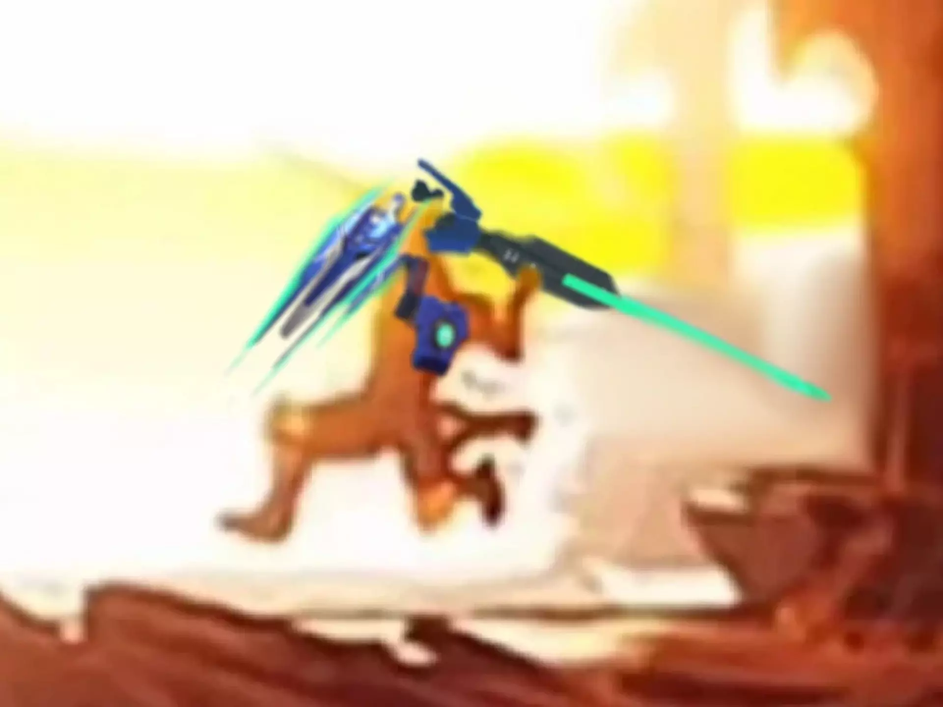 这是高达类手游的玩家日常分享,展示了玩家操控量子型00敢达全刃式,和群友操控的艾比安敢达进行1V1单挑的对战过程,呈现了机甲对战中的射击、近战等战斗画面。