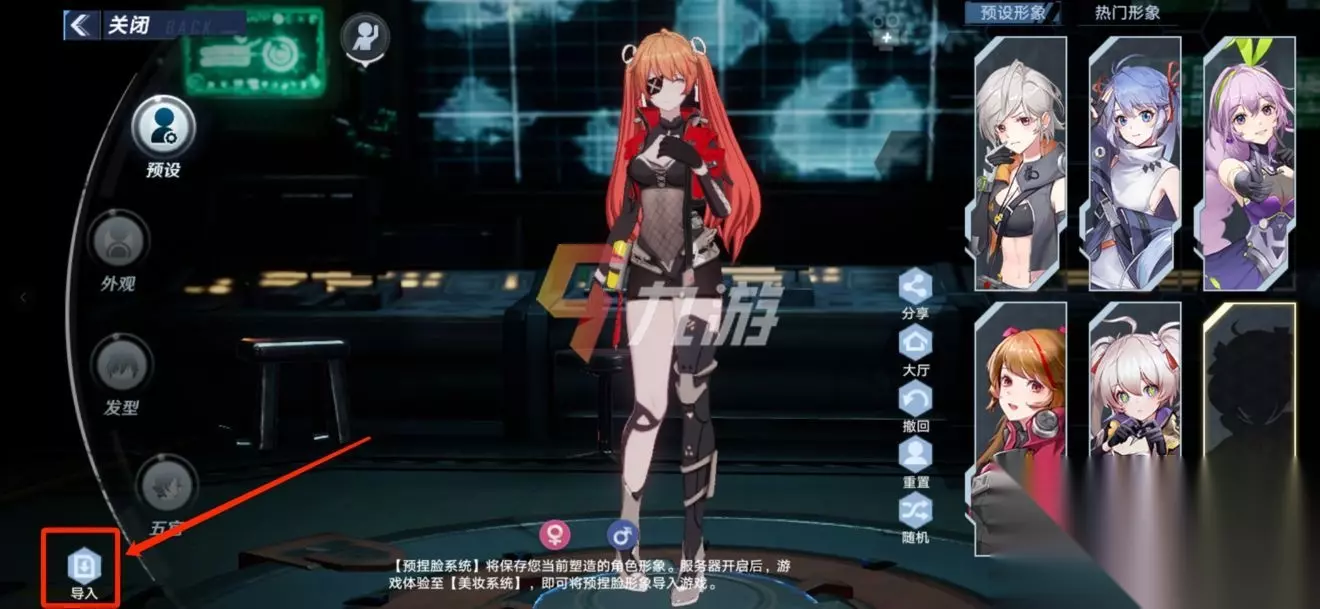 捏脸数据六【02】 形象ID:161454 体型:女 捏脸数据七【佐助】 形象ID:2163 体型:男 捏脸数据八【一方通行】 形象ID:161655 体型:男 捏脸数据导入方法 可能一些小伙伴们如何使用其他玩家的捏脸数据,其实不难的,我们在捏脸界面点击左下方的“导入”;