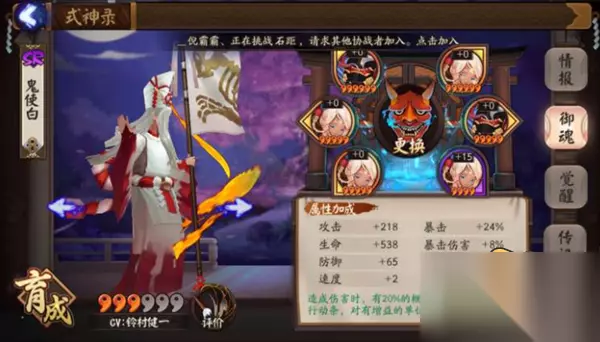 3、秘闻副本 妖刀的秘籍,第七层回合三:鬼使白×1。 河畔童谣,第六层回合一:鬼使白×1。 雨女的等候,第九层回合二:鬼使白×2。 暴风之巅,第六层回合三:鬼使白×2。 伞剑的守护,第六层回合三:鬼使白×1。 夏之风物诗,第一层回合二:鬼使白×1。 青灯百物语,第八层回合一:鬼使白×1。 大天狗副本 - 六层3回合:鬼使白*2 姑获鸟副本 - 六层3回合:鬼使白*1 镰鼬副本 - 一层2回合:鬼使白*1 雪童子 - 九层:鬼使白*3 清姬 - 七层九层:各鬼使白*2 吸血姬 - 九层十层:各鬼使白*1 彼岸花 - 八层:鬼使白*1 金鱼姬 - :鬼使白*1 4、其他 结界突破中也可以遇到鬼使白。 5、鬼王封印 青行灯 - 第三层:鬼使白*1