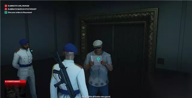 如果你成功完成了这次射击测试,那么马库斯·施托伊弗桑特会非常高兴。 他会支开保安队长和旁边的其它人,有私话单独对你谈。 你可以利用这个时机,将马库斯·施托伊弗桑特推向楼下,或者使用其它方法将它清除掉。