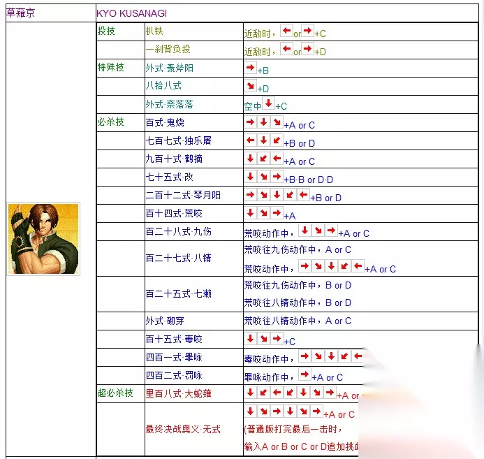每一位人物都有专属的技能和动作,根据顺序操控才是有效的。接下来是关于 拳皇97出招表(火神)摇杆带图 所有人物(草薙京)出招表摇杆带图大全的解答。