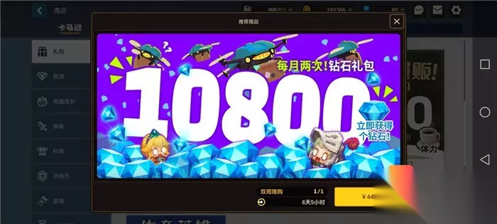 4、钻石礼包:钻石礼包的价格是448元,购买以后玩家可以立即获得10800付费钻石,每月限购两次。