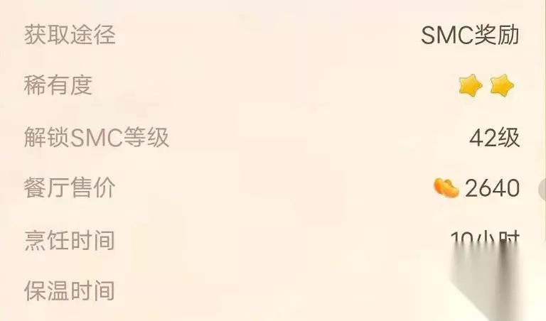 获取途径:SMC奖励 解锁等级:42级 餐厅售价:2640摩尔豆 烹饪时间:10小时 保温时间:50小时