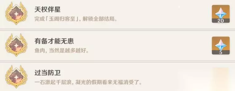《原神》凝光 邀约任务全结局流程图攻略 一、邀约成就 1、有备才能无患:在有福同享邀约剧情中,需要抓7条鱼,才能获得成就。 2、过当防卫:在回马枪邀约剧情中完成 3、天权伴星:解锁完成全部凝光邀约