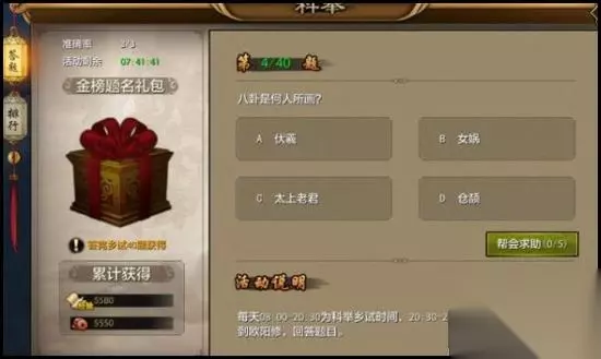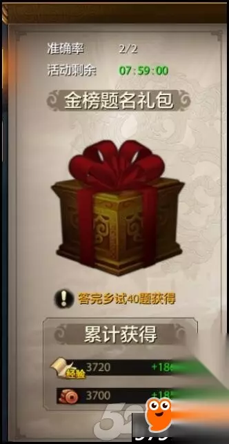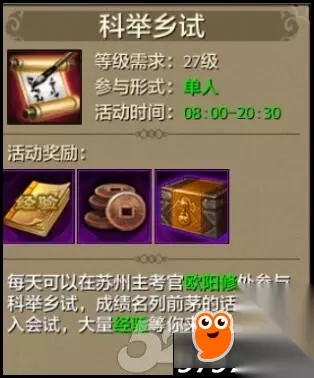 【活动奖励】 活动的奖励分为两种。首先是答题的时候获得的经验和铜币奖励。回答问题正确会获得一定数量的铜币和经验值。回答错误只获得一半的奖励。具体的奖励多少,是根据参加活动玩家的人物等级来定,等级越高,获得的奖励也就越高。除了回答问题的奖励外,在完成乡试的全部40道题之后还会获得一个金榜题名大礼包,可以随机开出一些珍贵的道具。