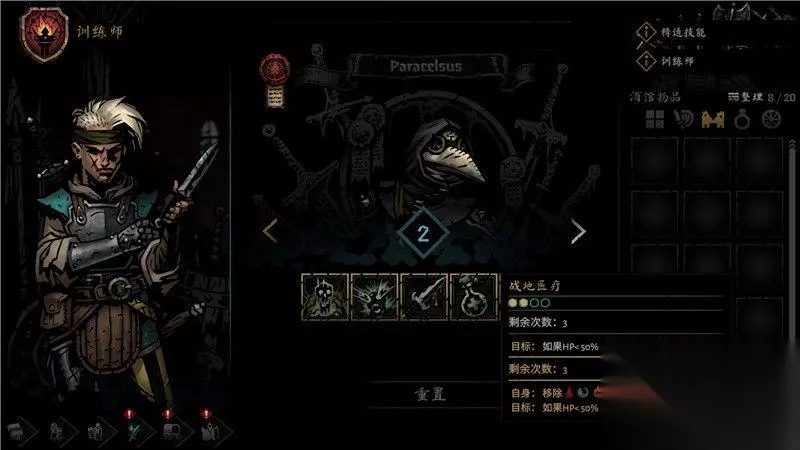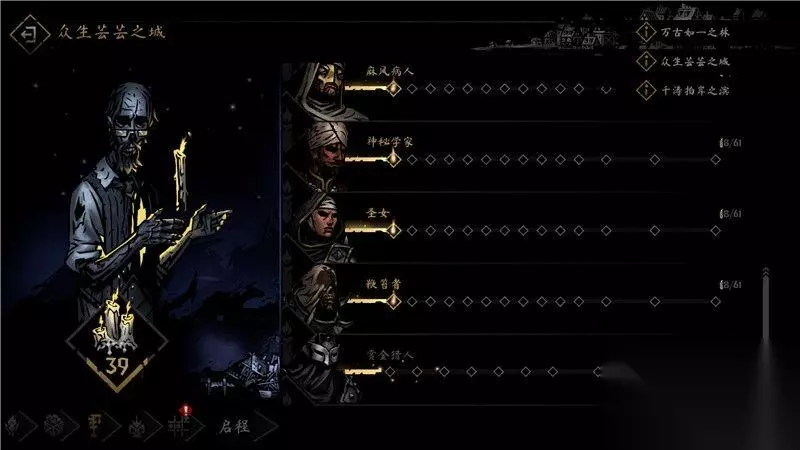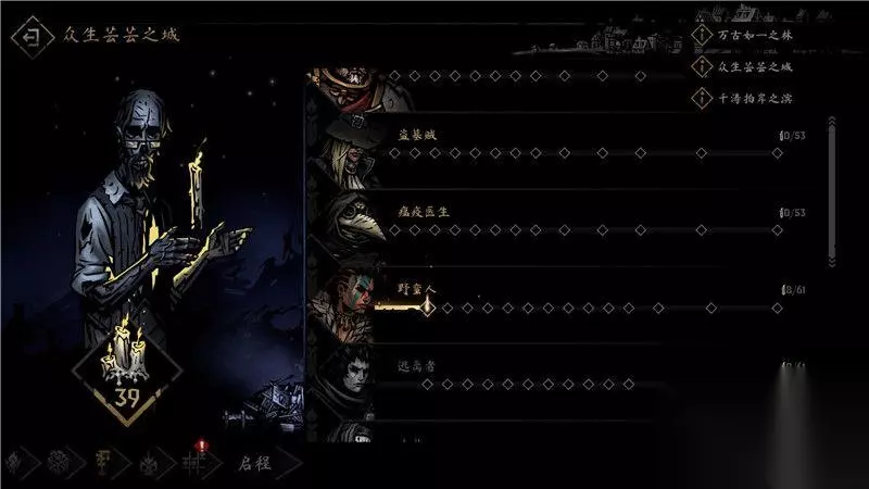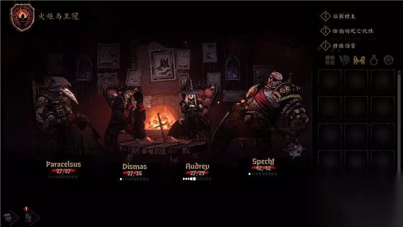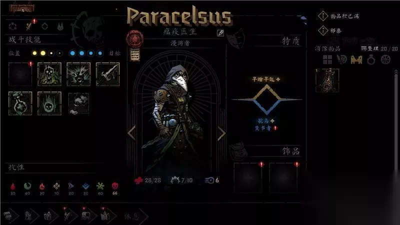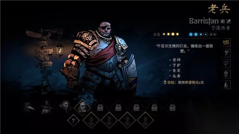 期初,你只能选择游戏中默认的4名角色,他们分别是瘟疫医生,盗墓贼,强盗和老兵。 这4名角色承担着队伍中的肉盾坦克,近战输出,远程输出和魔法输出治疗的作用,他们是一个非常平衡的队伍。