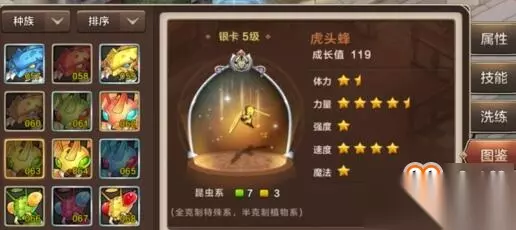魔力宝贝手游虎头蜂加点详解 3力2速或3速2力 虎头蜂属性 品质:银卡5级 种族:昆虫系 成长值:119 体力:14 力量:44 强度:8 速度:41 魔法:12 虎头蜂技能 混乱攻击Ⅰ攻击命中目标后,有15%概率让目标混乱,持续2次行动。