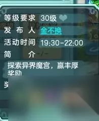 先讲最基本的组人: 喊:不挂机的不跳车的来(这个很重要)这个活动真的不能挂机,不然奖励也会少,拖慢整个队伍前进速度。 异界魔宫在每个月的第二个星期的星期天会有,19:30是准备时间可以进场等待,20:00开始