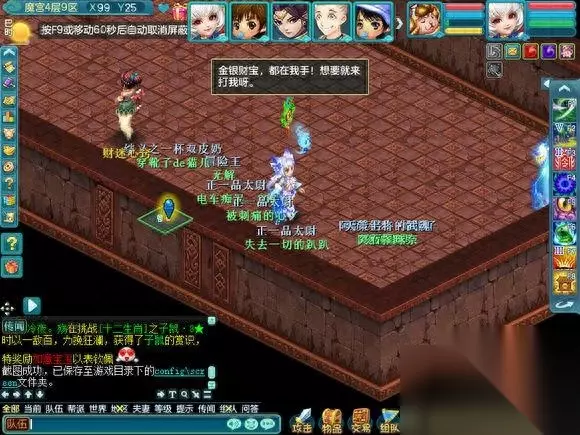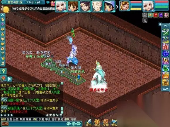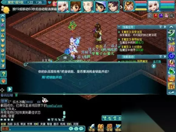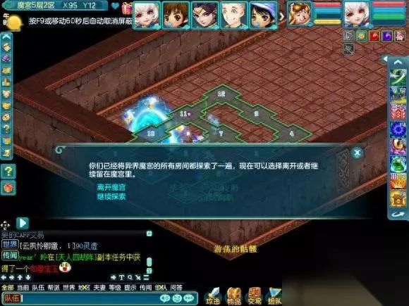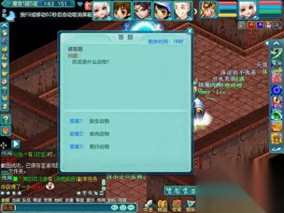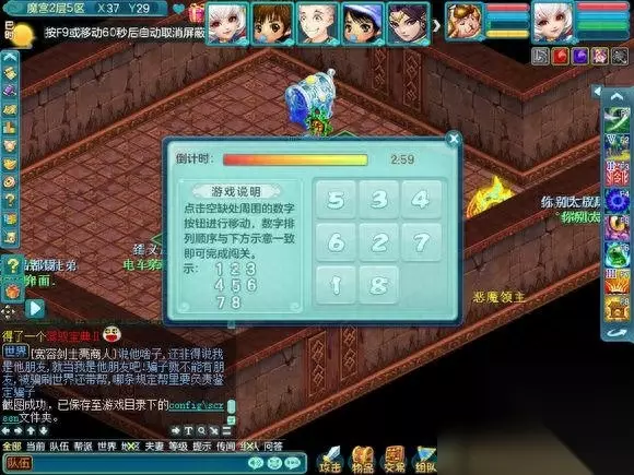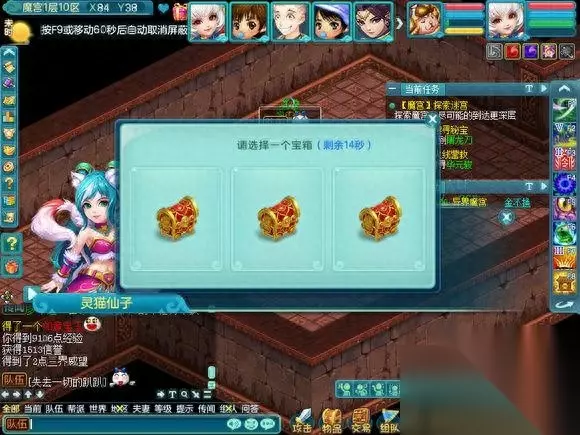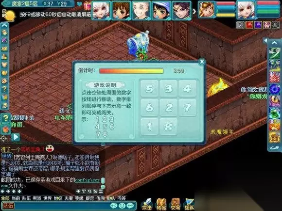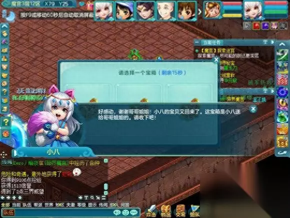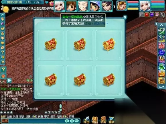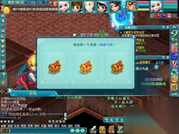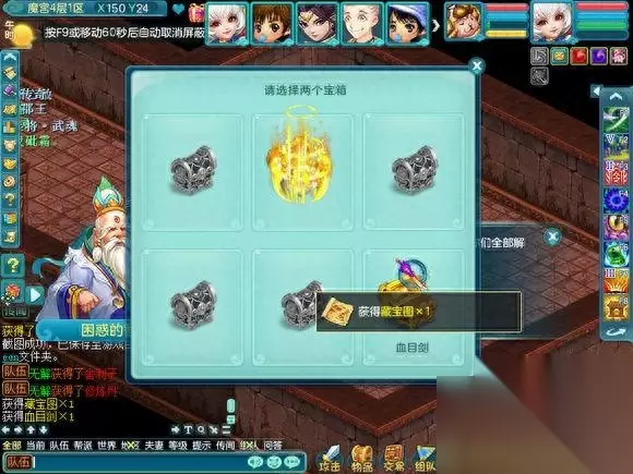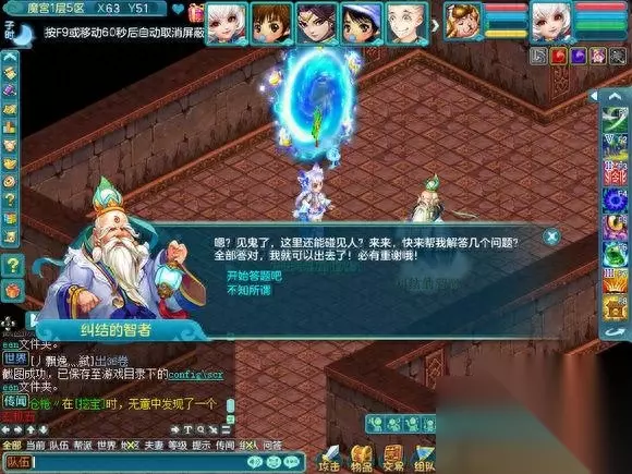 现在开始介绍在魔宫里面会遇到什么,因为会遇到小游戏和丢骰子抢奖励的事情,所以挂机会拖慢整个队伍的速度使队伍无法前进和奖励也会减少很多。 首先是纠结的智者,其实就是答题,但是这个智者的胡子是白色的,所以说明,是队长一个人答题的。是根据答对的数量给予奖励的, 如果答对的少 就是一个银色箱子五个人抢奖励,中等就是像FB一样每个人都有三个箱子可以点,答对的几乎全对,就是两组三个箱子可以点(只可以上面三选一,下面三选一,一共二)