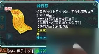 进场以后,5个人手上都会有一个道具 1.神行符: 当自己迷路以后,就是转来转去有点乱了,就叫队友右键神行符。
