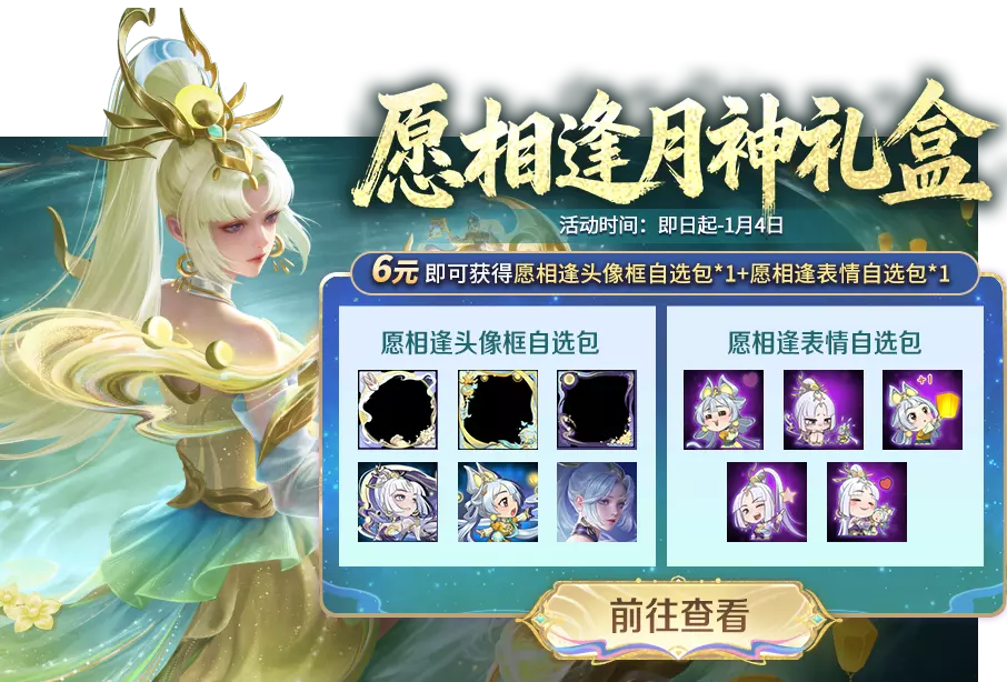 活动期间,仅需6元即可获得愿相逢头像框自选包、愿相逢表情自选包!