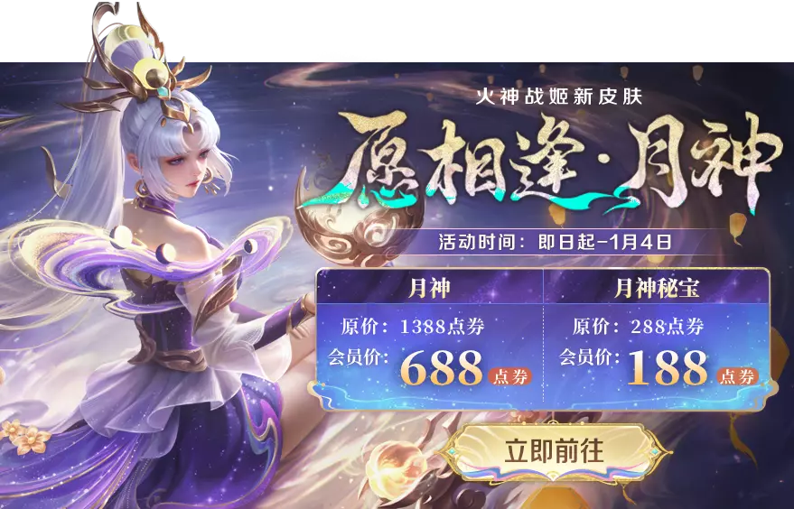 火神战姬-月神皮肤限时折扣开启!拥有火神战姬会员卡,可享受会员价购买火神战姬月神系列皮肤。