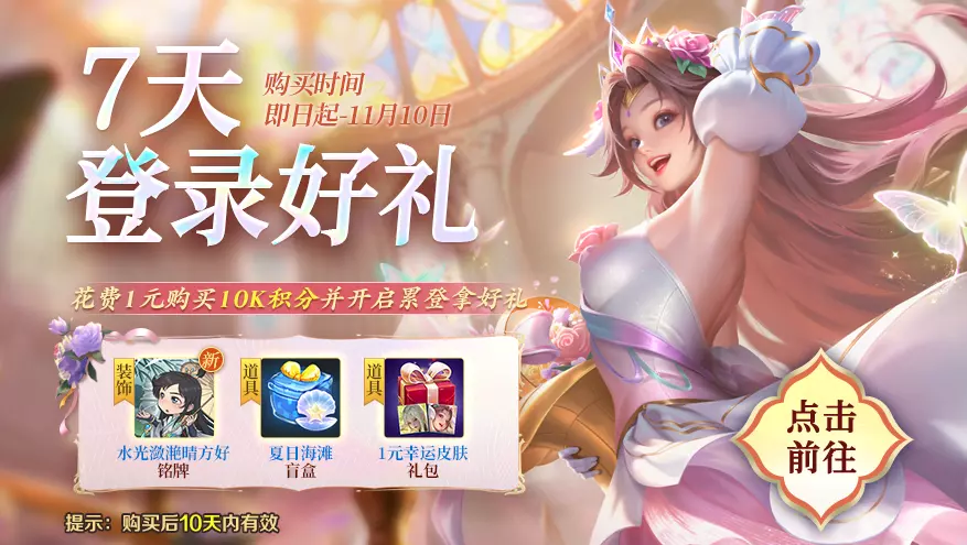 仅需一元购买10K积分,即可开启连续7天的登录福利!拿水光潋滟晴方好铭牌、夏日海滩盲盒、1元幸运皮肤礼包!