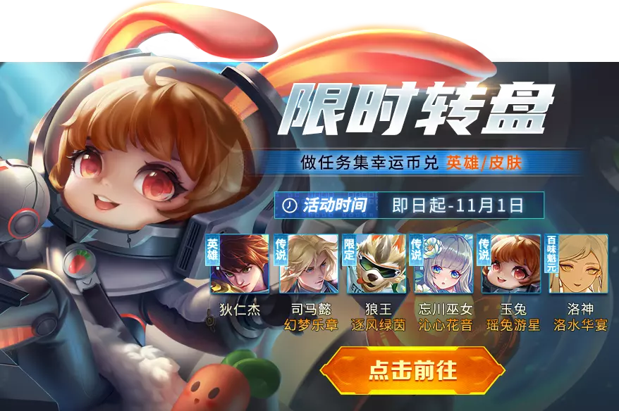 参与限时转盘完成每日登录、对局等任务,集幸运币兑换狄仁杰永久英雄、司马懿-幻梦乐章、狼王-逐风绿茵、忘川巫女-沁心花音、洛神-洛水华宴、玉兔-瑶兔游星、亚瑟王-嫣蝶魅影!
