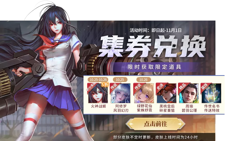 活动期间限时集券兑换,可限时兑换积分英雄及皮肤,火神战姬、阿修罗-风羽幻刃、佐罗-雅剑侠心、绿野花仙-紫姝妤霓、龙影-龙腾贺禧、后羿-量子神弓、黑桃皇后-碎星重狙、周瑜-碧羽公瑾、传世名书传送特效等好礼!