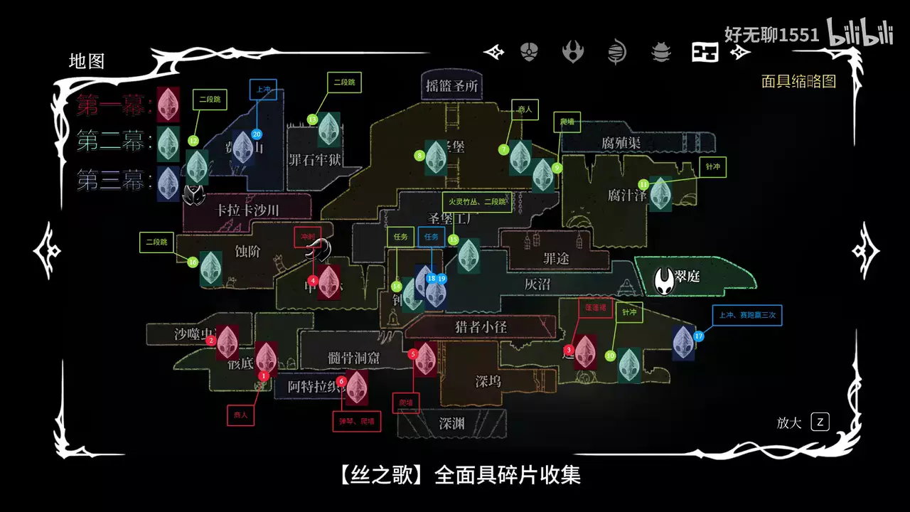 本文分享了B站玩家糊露露露露的《丝之歌》第二幕100%全收集必备地图,包含总览大地图以及巨扉之门、圣咏殿等多个区域的详细地图,标注了收集点位、任务、BOSS战、道具获取等信息,助力玩家完成全收集。