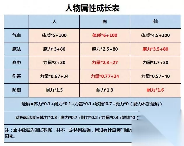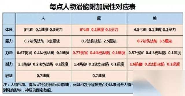 二、潜能点和人物属性的关系 1.种族初始属性:一般来说,能重置的属性只有升级潜能属性、潜能果属性、机缘属性及月饼、粽子、金丹的额外属性。基础人物属性是不能被重置的。各种人物基础属性如图所示: 2.人物属性及潜能附加:升级属性实际上也算在基础属性里面。以109为例,你的升级属性=基础属性+人物等级,而且这个属性是不能被重置的属性,而人物属性又根据不同公式转变为命中、伤害、体质、防御等属性,具体情况如表所示:
