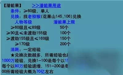 3.常见门派固定伤害与敏捷之间伤害系数的关系 女儿村:雨落寒沙的敏捷系数加成为50%;暗器的敏捷系数加成为30%。 普陀山:五行学说的敏捷系数加成为敏捷70%。 阴曹地府:阎罗令的敏捷系数加成为35%。 无底洞:夺命咒的敏捷系数加成为70%。 盘丝洞、花果山和天机城的固伤加成系数为力量和人物伤害面板,此处不做计算。 固定伤害还和经脉、武器伤害、灵饰等因素有关,所以此处不提这些因素。 4.注意事项:人物装备、召唤兽装备的附加属性计算基本一致,但召唤兽需要额外算下资质和成长,所以不能简单的用人物属性对应来一以概之。 5.特别声明:测试结合经验得出的数据,与实际精确结果可能稍有偏差,仅作参考。 三、重置属性的时候应该注意的事情 1.重置人物属性时要注意保存,保存人物属性可以找云游仙人(长安城264.185),花费20W可保存一套,一共可保存四套,随时更换。每次更换属性消耗(游戏币5W*更换次数+50点体力),消耗重置时间为每日零点。 2.当升级或通过潜能果、粽子、月饼、机缘等方式获得的属性会自动转变成潜能点保存在云游仙人处,分配消耗为5W/点。 3.如果想调整好自己的人物属性,最好在重置人物属性时给自己的装备打好临时,然后根据不同需要来进行加点,可以最大程度上避免二次洗点。 四、潜能果和机缘属性 1.人物达到一定的等级后,可以找老猕猴(花果山145.106)换取潜能果,具体如图所示: