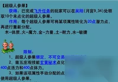 2.超级人参果:飞升后的玩家可以找吴刚(月宫9.34)领取10个超级人参果,具体用途及功能如图所示: