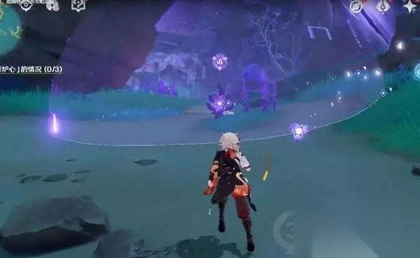 (3)观察三处「御影炉心」的情况。其中,中间这一处的观察需要摸雷灵。 ①在附近拿雷种子穿入雷屏障,点调查完成