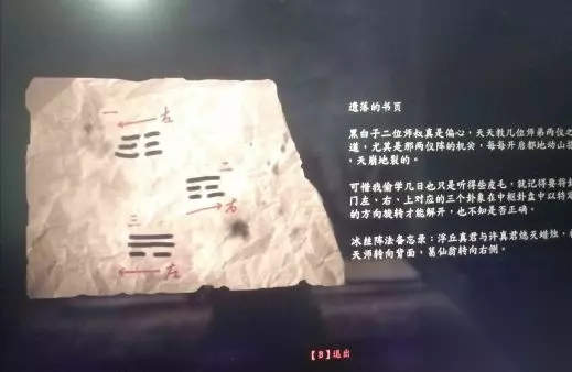 按上面的图案和方向转到发光的门就行(左右要按住不放,直到转到对应图案,顺带一提,这个图案是从发光门看的,别直接在轮盘上用眼睛看,不然就会像我一样傻逼兮兮的卡了半天) (纸上后面半段是用来解右边门里面的谜题的,灭灯是把牌子转到一定角度自己会灭) (一个提醒,红珠子开掉体温那边的门,绿的开藏经阁下面墙上) 第二次八卦,去看左边的门上面那圈符号,取左右上,转的顺序还是左右左 (方便就画下来)