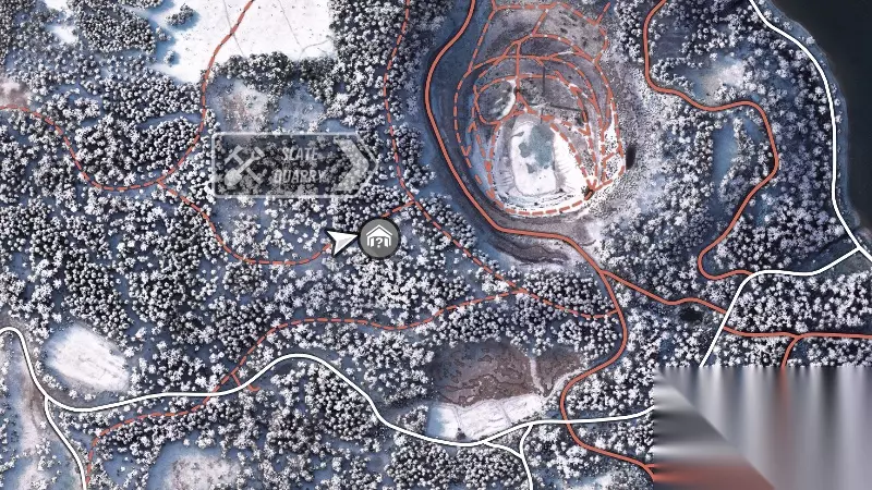 来到距离车库最近的主干道路(往采石场方向),车库就位于道路右侧,位于树林中一片空旷之地上