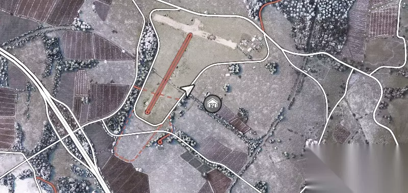 驱车来到小机场旁边的公路,找到一条地图上没有标记的小路,尽头就是隐藏车库位置了(实际上视野里已经出现车库了)