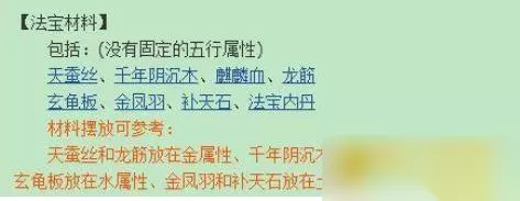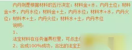 3.合成法宝的材料具体摆放位置:材料金 水,内丹放土、材料金 土,内丹放水、材料金 木,内丹放水、材料木 水,内丹放火、材料木 土,内丹放火、材料水 土,内丹放木(有时失败了的话,内丹放金,根据土生金,金生水)。九眼最好放在火的位置,一级法宝放最后剩的位置,若火位置被占了,九眼跟一级法宝随便放即可。