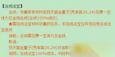 1.完成法宝材料收集的任务,即可收集法宝材料,收集所有材料后找天宫金童子(兜率宫26,24)花费一定体力及金钱合成(合成100%成功)