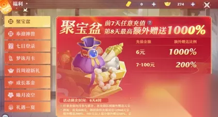 开服前七天任意充值(月卡,战令,基金等)均可参与累计,充值1-6rmb,额外赠送1000%元宝(最多600元宝);充值7-100rmb,额外赠送200%元宝(最多94*2*10=1880元宝);充值101-1000,额外赠送50%元宝(最多900*0.5*10=4500元宝)。 如果前七天总共充值30rmb,第8天可以额外获得600+240*2=1080元宝。如果前七天充值648rmb,第8天可以额外获得600+1880+5480*0.5=5220元宝。如果前七天充值超过1000rmb,第8天可以额外获得600+1880+4500=6980元宝。 小氪玩家优先考虑月卡,基金和战令,还有首周迎新礼,新人限时特惠等活动,如果急需元宝的话可以直充,建议搭配25%首充双倍、霸气星期五和25%福运满满再充值,再搭配聚宝盆,最多可以领取275%-375%的元宝。 新服专属霸气星期五: 开服的个月每周五都赠送免单,根据邮件线索于周五在世界频道发送文字答案(直接在世界频道抄答案即可),即可获得 10 分钟免单状态,在免单状态内完成充值,可免单 6480 元宝。 新人限时特惠: