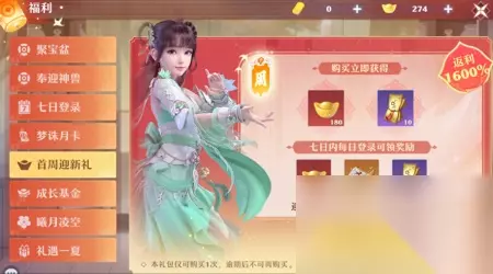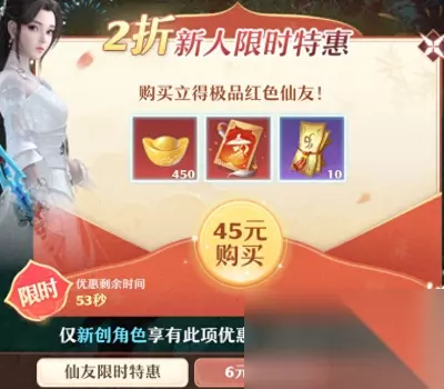 使用rmb购买元宝限时赠送道具,比如6rmb可以获得60元宝+10拜帖,45rmb可以获得450元宝+10拜帖+1仙友宝箓(可以自选红色仙友),一般后只持续几小时时间,过期无法再参与。 拜帖之类属于前期比较缺的资源,性价比还算不错,有需求的小伙伴可以考虑入手。 首周迎新礼: