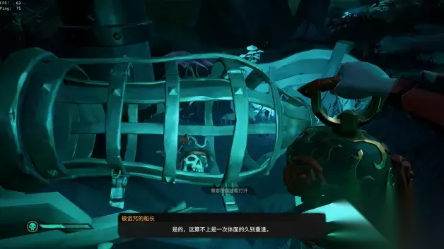 但是不急,我们此时要先拿到船长的头骨,到这里用刀砍一下绳子,笼子就掉下去了。