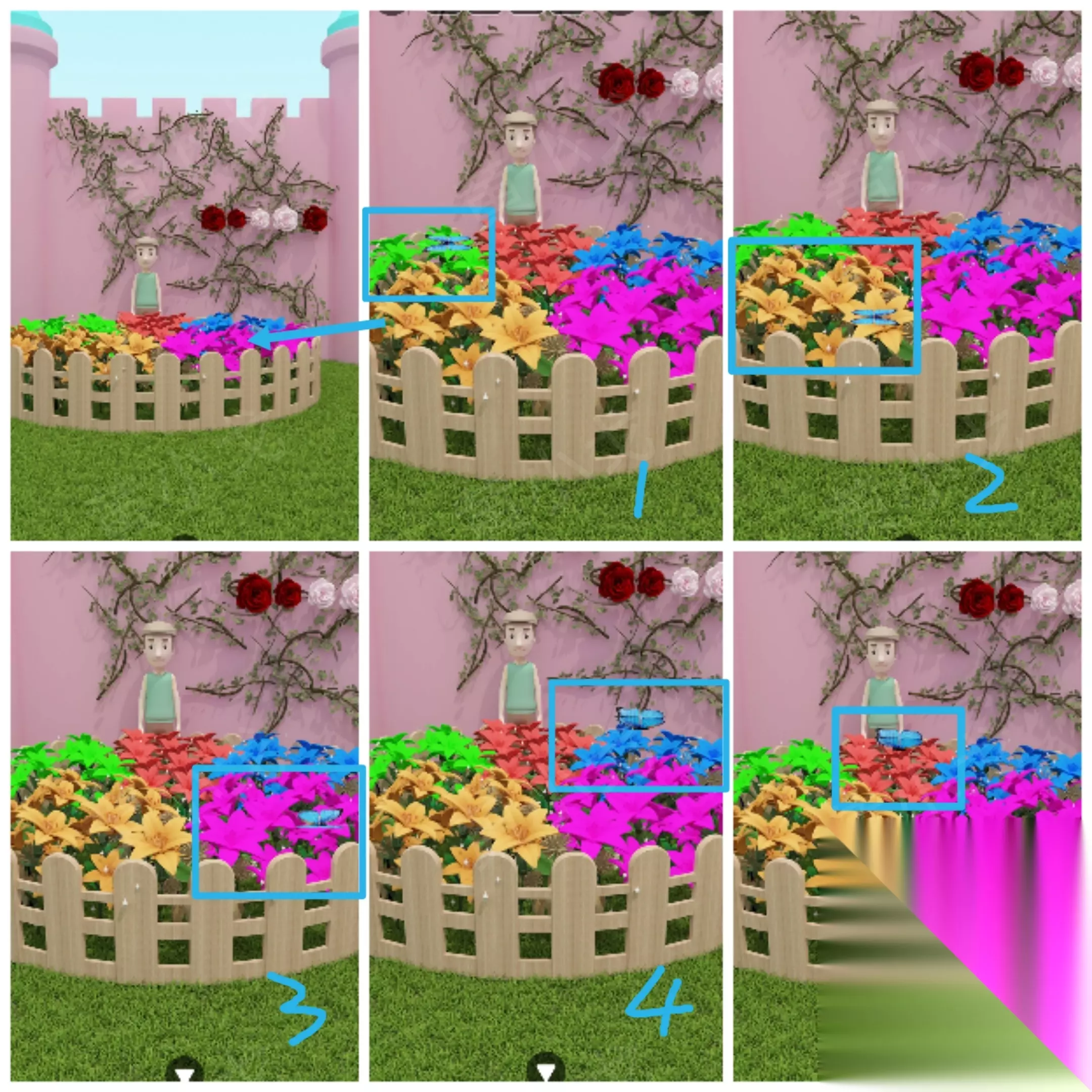 7. 大门场景(续) ⑰ 根据蝴蝶顺序调整第四个箱子密码锁:绿橙紫蓝红
