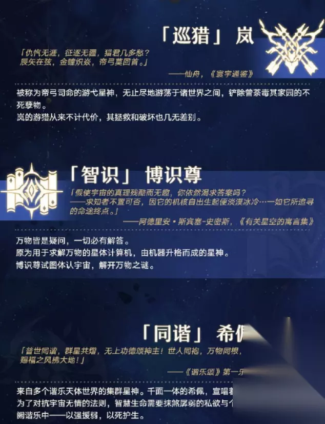 《崩坏:星穹铁道》的开场图片 在《崩坏:星穹铁道》的世界观中,存在着一些“星神”。虽然叫“神”,但它们更像是一些高度抽象、凝练的哲学概念,而不是奇幻概念上的神灵。银河中的绝大部分群体都有自己笃信概念,也就从属于对应的星神。像是主角所在的星穹列车,在银河间穿梭,不断探索未知的边界,因此属于“开拓”星神阿基维利。