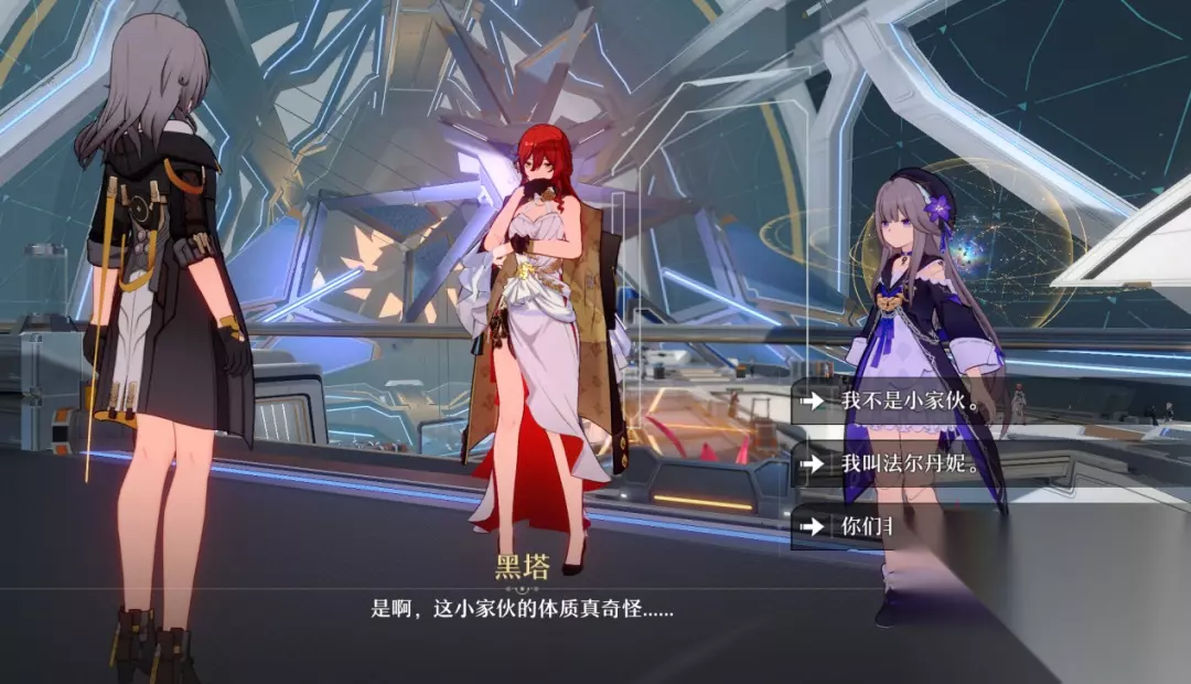 空间站“黑塔”是游戏的第一站,后面就是诸多形态、文明各异的星球了 当然,玩家和主角都能猜到,这是唤醒者背后的势力把一颗钉子埋入了星穹列车之中(她们甚至没特别隐瞒这一点)。因此之后剧情推进中的一些对话也就显得耐人寻味,比如当“看板娘”三月七询问主角为什么躺在这时,玩家可以选择撒谎,称自己就是这座空间站的工作人员。在后续对话中也有不少避而不谈式的选项,如果玩家这么选择,就等于自己塑造出了一个有些心怀鬼胎的主角。这种叙事方式给了玩家不小的角色塑造空间,对一款二次元游戏来说还是挺令人惊喜的,这可以说是给剧情提供了更大的可能性,没准之后的故事会因为玩家的选择而产生变化——我说的是真正的变化,而不是那种过程微调、结果依旧的伪变化。