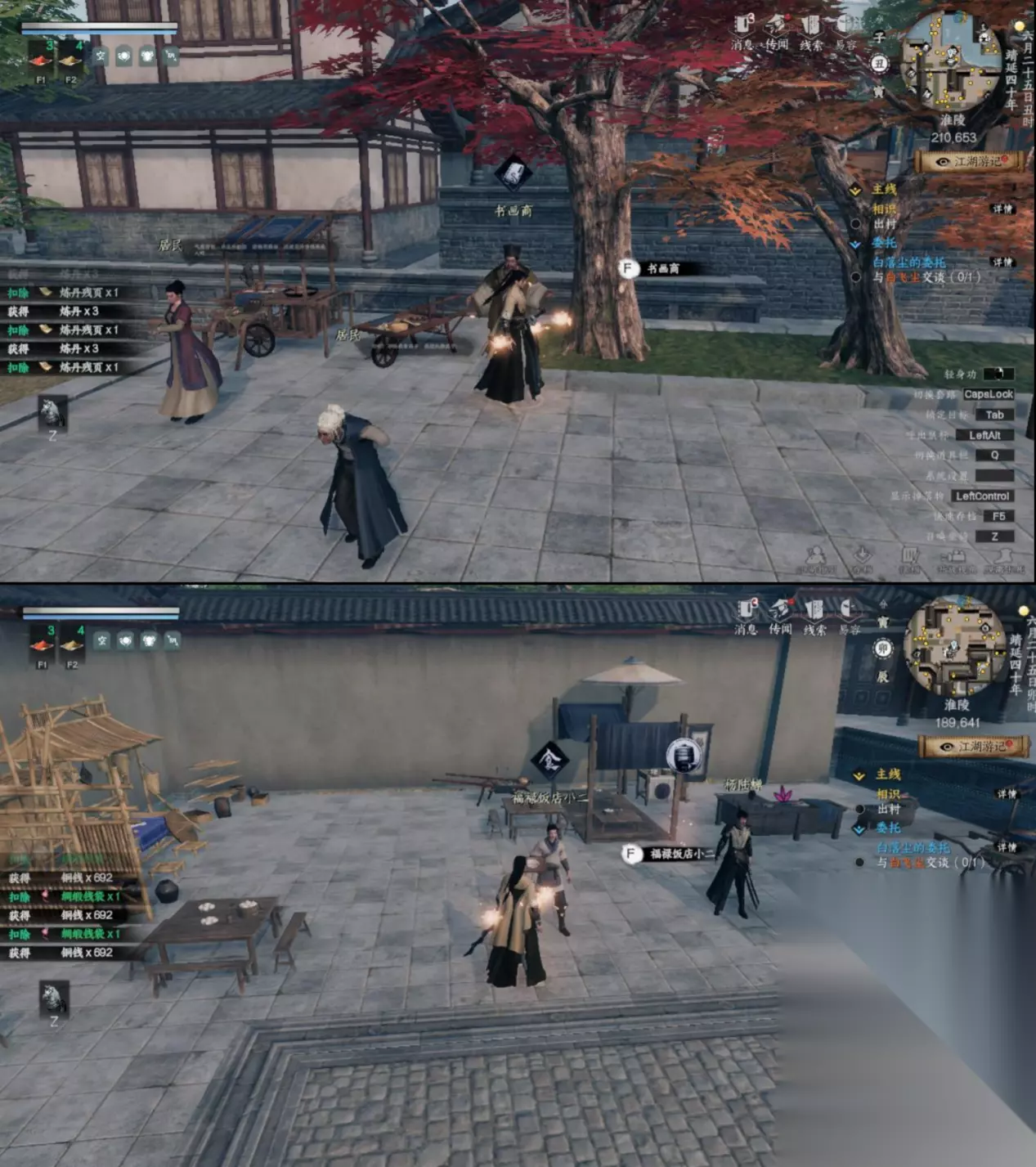 4 淮陵书画商(210.653)买道学、炼丹、酿酒,福禄饭 店小二(189.642)买 20 个水饺。