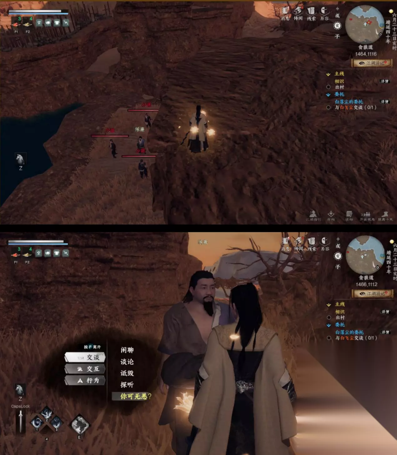 4.打一下丹阳子(1185.1486),打怪获得的修为可以先升几 个经脉,优先带脉,修为书不要吃!。 5.到雁州城外(1464.1116)存下档,然后下去一个个引沙匪, 全部打完后和陈廉对话选把你身上钱交出来就好了可以获 得几十万铜钱。(根据主线人物和人物属性的不同存在波动)