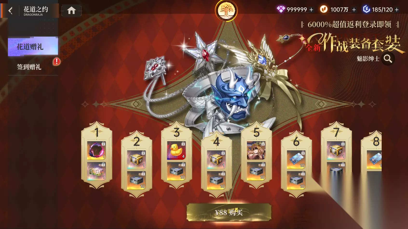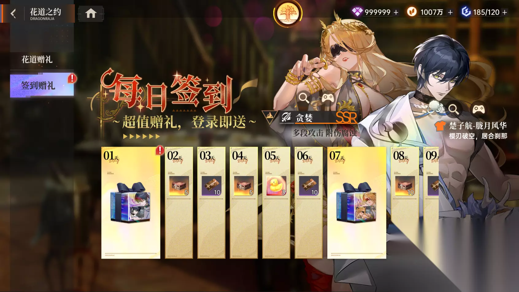 全新七原罪伙伴登场,七原罪-「贪婪」强势降临,签到即可免费获取! 她是炼金术与欲望交织的具象,身披暗金鳞甲,眸中流转着永不餍足的幽光。指尖缠绕的锁链化作镰刃“噬魂之契”,每一次挥动皆如商贾清算债务。 新角色是土属性攻击型角色,普攻“收债”双重斩击撕开血肉,攻击单体造成伤害,随后额外追加1次攻击; 言灵“命运典当”叠加防御裂隙,攻击敌方单体造成伤害,能给目标添加1层【腐蚀】,让目标的持有者防御和减伤下降。 5. 花道赠礼-签到福利
