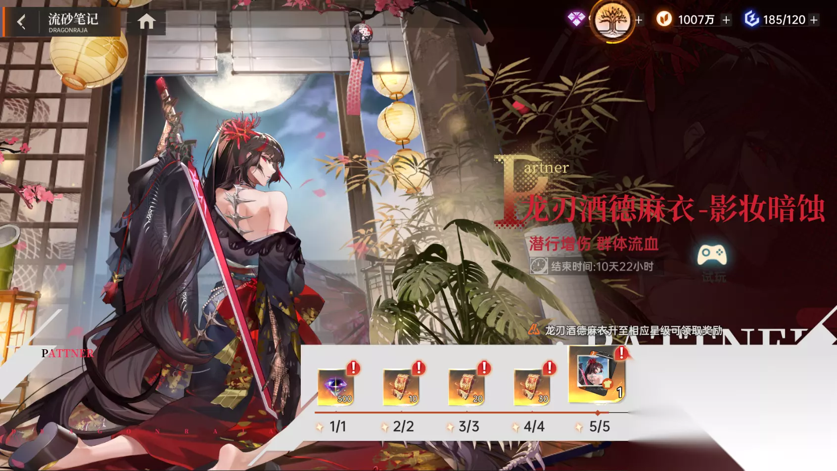 她曾是东京大学音乐系的星辰,如今却是暗影中淬炼的致命刀刃。双生血脉里流淌着艺术的高雅与忍者的杀伐,两把神代名剑“天羽羽斩”与“布都御魂”在她手中重绽锋芒,斩碎过龙骨十字的禁忌,也劈开极渊深处的绝望。 全新SSR限时伙伴-龙刃酒德麻衣加入,龙化御姐降临,优雅猎手锋芒毕露!参与活动即可免费兑换全新限定SSR-龙刃酒德麻衣。 龙刃酒德麻衣是一位全新的攻击型伙伴,普攻命中后有概率添加【流血】效果,使目标行动后受到真实伤害 言灵则是能进入【潜行】状态,随后攻击敌方全体造成伤害,并给目标添加负面buff。【潜行】状态下,角色是无法被非群体技能指定为目标。被动技能则是能加强技能的【流血】效果,提升龙化酒德麻衣的输出能力。 2. 龙刃酒德麻衣-主题活动