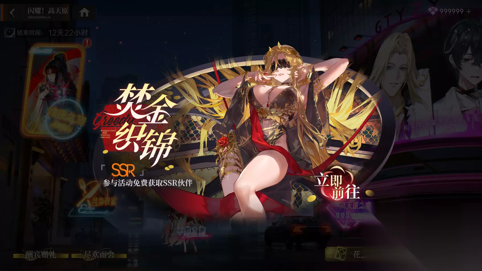 半周年盛典开启,邀您共赴高天原的霓虹盛宴!赠送礼物给三位高天原人气明星,累计提升伙伴的好感度等级&总好感度等级,达到一定阶段时可获得多种丰厚奖励。 高天原特别剧场·霓虹迷城限时开放!限时剧情等你解锁!踏入东京歌舞伎町的极乐殿堂,鎏金灯影下,卡塞尔三人组化身牛郎天团惊艳登场! 4. 焚金织锦-全新伙伴免费领取