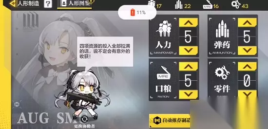 人形制造秘籍: 1.使用系统推荐公式直接制造,方便快捷。 2.手动输入特定公式,制造特定类型的战术人形。 希拉的提示:可以注意一下协助者的气泡文字哦!听说会告诉你特殊的公式~ 总的来说,其实多打几把收集资源,然后自动推荐制造就可以了~