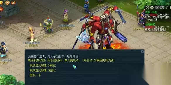 特别说明 1、单人挑战和组队挑战每天各有3次挑战机会,中午12:00刷新 2、挑战分为四个阶段:掌控、锋芒、坚韧、激怒。每个阶段蚩尤邪念的状态和做出的选择各有不同,少侠可在不断地挑战中寻找规律并选择合适的应对策略,以便对蚩尤邪魂造成更高的伤害。