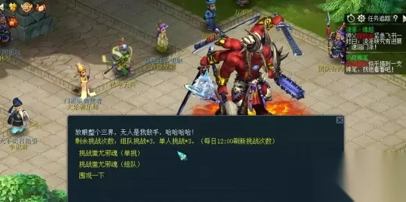 3、战斗结束后对蚩尤邪魂造成的总伤害越高,奖励越丰富; 4、当全服玩家造成的伤害累积到一定数量后该boss就会被封印,在每天中午12:00再次解除封印并恢复至满血状态。