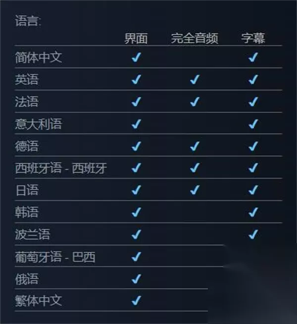 支持语言:简体中文、英语、法语、意大利语、德语、西班牙语 - 西班牙、日语、韩语、波兰语、葡萄牙语 - 巴西、俄语、繁体中文。