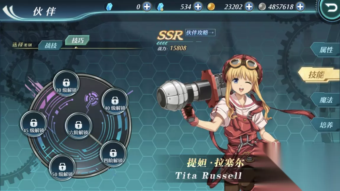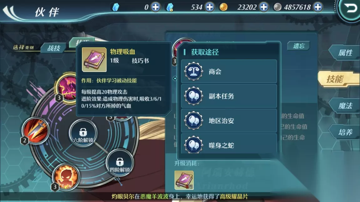 技巧的学习是需要使用相应的技巧书。每个伙伴都可以学习六个技巧,前四个技巧达到30、40、45、50级时就可以开启,最后两个技巧则只能达到四阶和六阶后才能开启。
