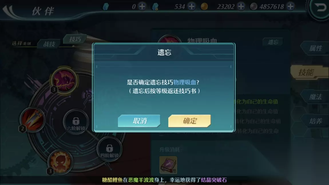 三、技巧遗忘与升级 如果我们培养了一段时间的伙伴不想再使用了,他之前所学的技巧也是可以重新让其他伙伴再学习的。我们点击遗忘按钮,就可以让伙伴遗忘该技巧,遗忘后按等级会返还技巧书。就可以给新的伙伴重新学习了。